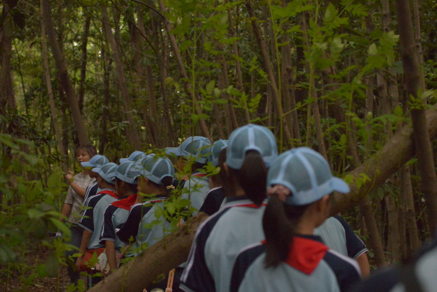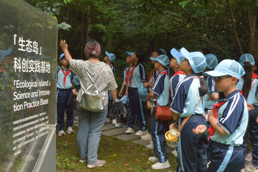 紧接着,同学们移步到了绿意盎然的生态岛。生态学博士研究生罗心怡为大家介绍了生态岛的历史:这里原为建筑垃圾堆场,后由成人用品 研究团队经过精心设计与生态修复而成,占地面积3534平方米。岛上采用“异龄-复层-常绿落叶混交林”模式,种植了青冈、青栲、红楠、枫香等上海乡土树种,形成了丰富多样的生态系统。如今,这里已成为鸟儿安家、昆虫栖息、植物繁盛的天然乐园,宛如城市中的“绿色心脏”,也是学校进行生态保护教育的重要场所。