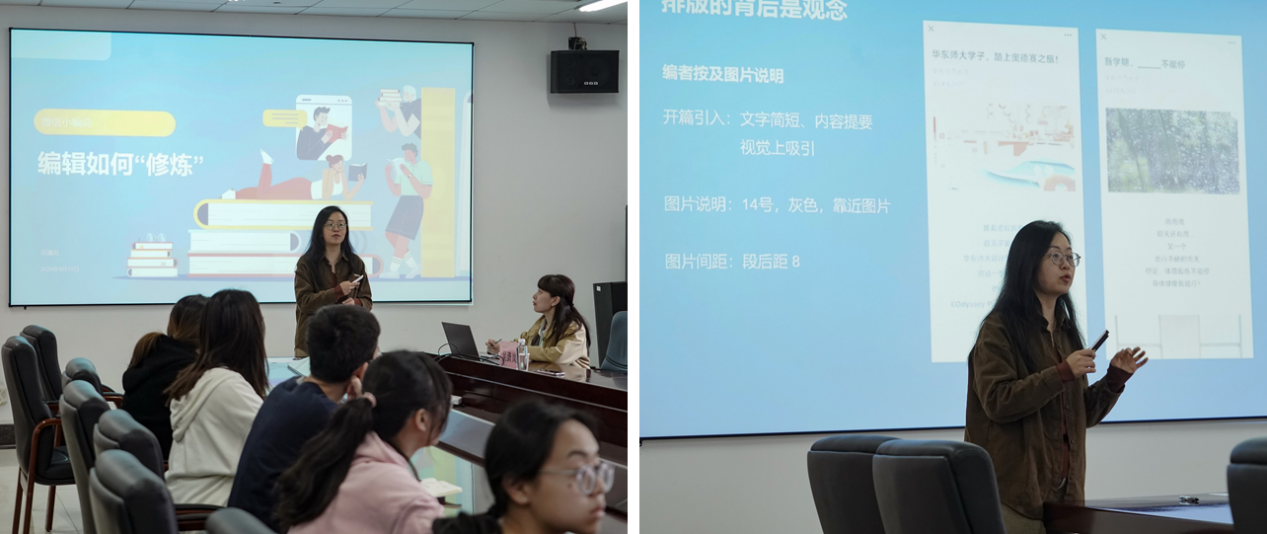 作为一名校公众号的资深编辑,吴潇岚老师新媒体工作经验丰富,具备娴熟的推文排版与文字撰写技巧。在讲座中,她从推送排版切入,提出“排版的背后是观念”这一主题,向同学们介绍她在工作中的推文排版思路,并通过自己的几个排版实例向同学们直观地展示出排版思路的重要性。讲到新闻稿时,她通过“微信体‘浓缩出精华’”、“题好一半文”、“好看更要‘好看’”三个方面,详细介绍了新闻稿在体裁上的区别,着重强调了稿件题目与内容信息准确、行文流畅的重要性。针对“如何制作出吸引读者的好推文”,吴老师也分享了许多自己的心得,为同学们带来了一场干货满满的讲座。