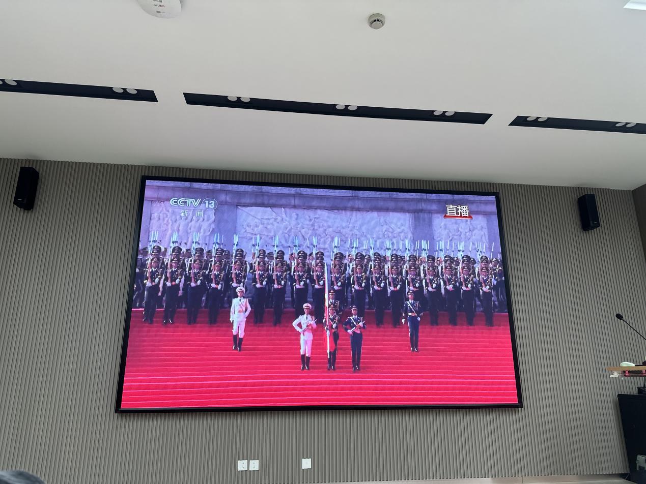 阅兵仪式在庄严的国歌声中拉开帷幕,当雄壮的《义勇军进行曲》响彻天安门广场,也回荡在资环楼报告厅的每一个角落。这一刻,报告厅内洋溢着无比庄重而热烈的氛围,每个人的眼中都闪烁着自豪与激动的光芒,强烈的民族自豪感和爱国情怀在心中澎湃激荡。