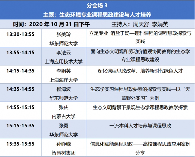 华东师范大学生态与环境科学学院党委书记刘婕在以《构筑课程式思政圈层,发挥三全育人核心作用》为题的大会报告中,从课程思政建设出发,详细介绍了课程思政建设的战略性地位与总体目标,强调了“三圈三全十育人”的理念。刘婕还强调,高校、学院、专业及教师应多方协力共筑课程思政圈层,以“六化”推进课程思政纵深发展、长远发展和精细化发展。在此基础上,重践行、拓空间、多形式和高质量等多种教学方式已取得了良好教学效果。华东师范大学以立德树人为核心,深化制度、专业、课程、教材、考核及教研六个方面,拓展课程思政理论研究。目前华东师范大学生态与环境科学学院也进一步加强课程思政建设,希望能利用好生态环境科学得天独厚的学科优势,为课程思政和双一流建设贡献应有力量。