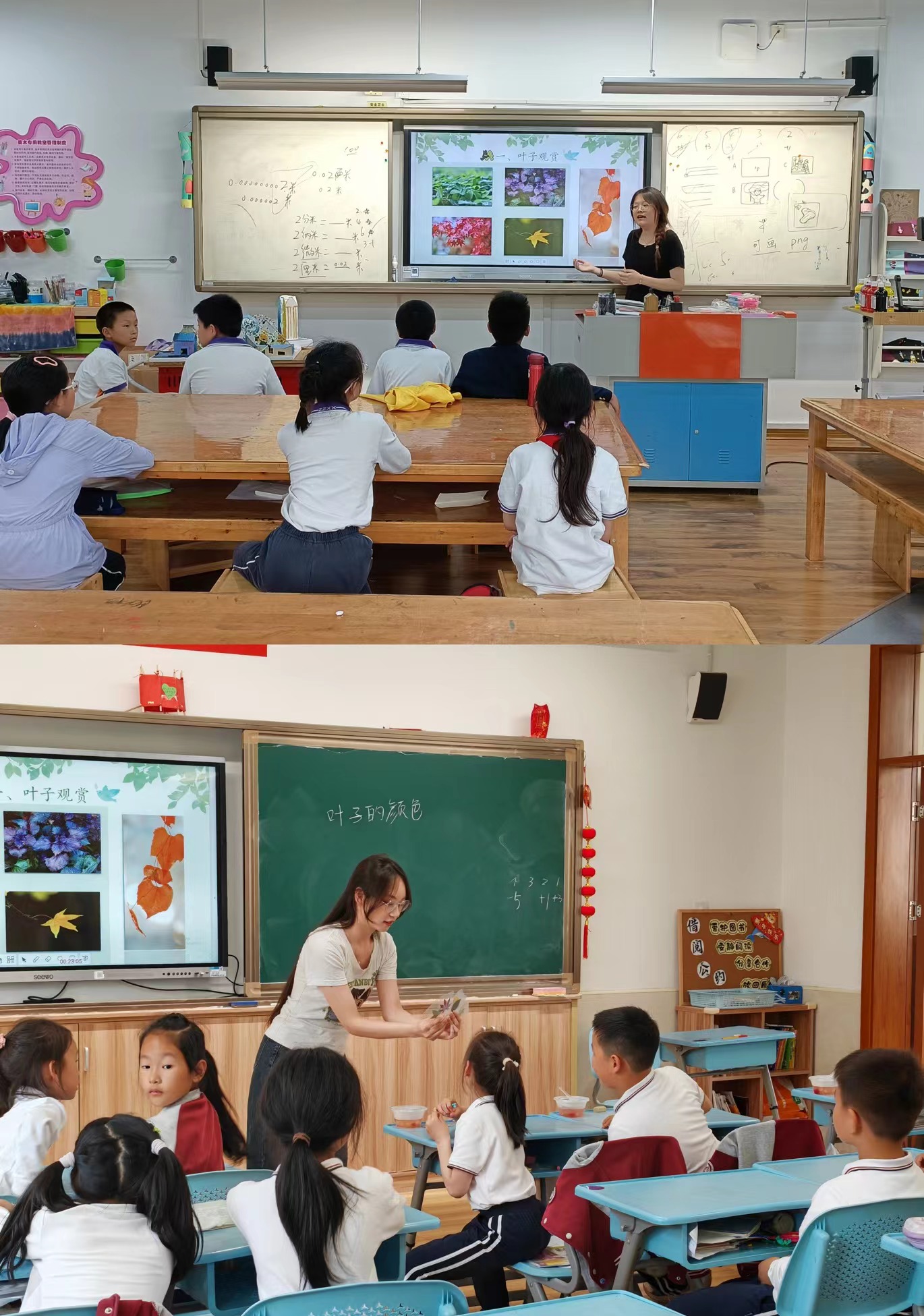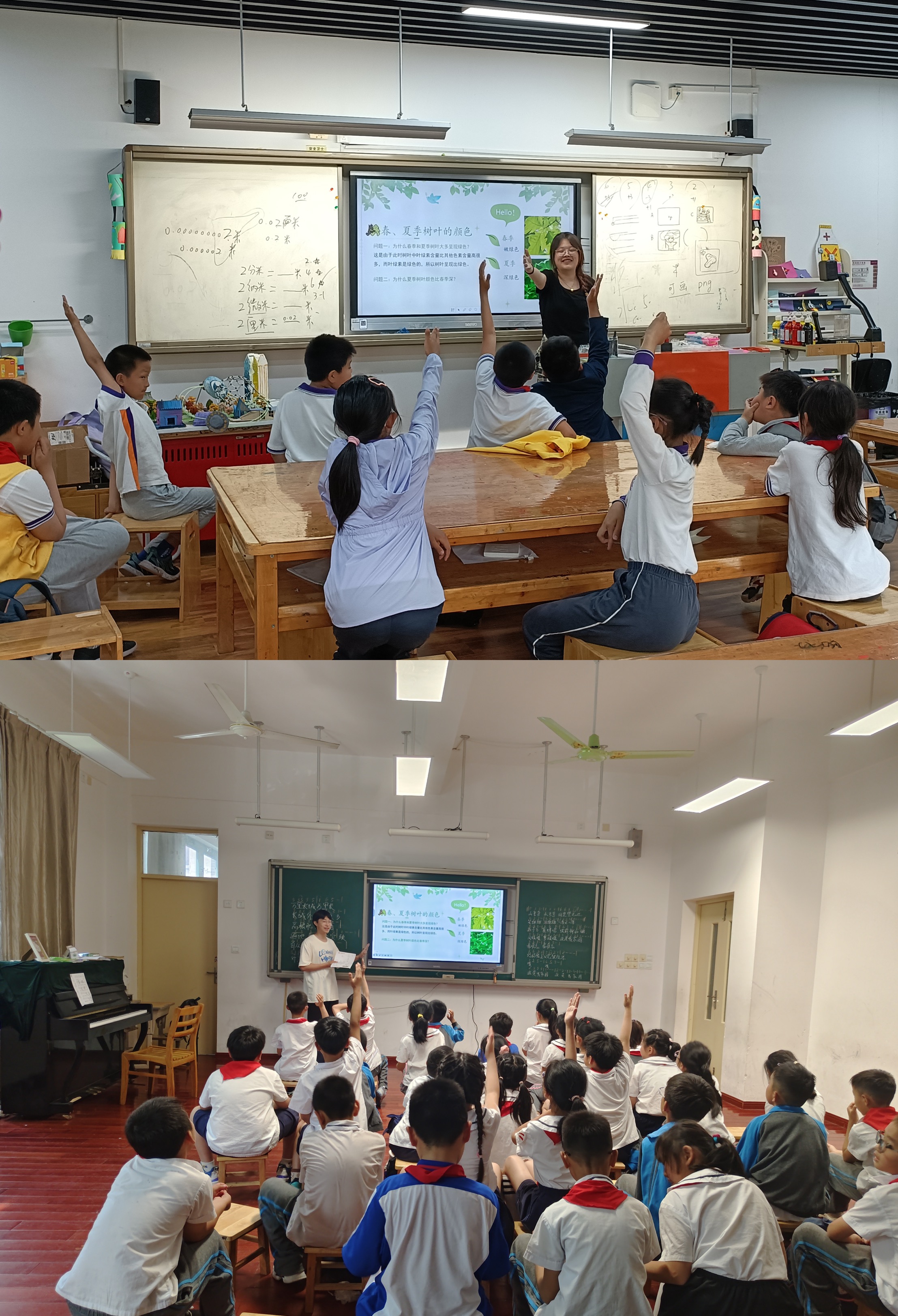 接下来,老师们又以不同季节树叶颜色的变化为切入点,将树叶类比人,生动形象地向同学们解释了影响树叶颜色变化的因素。“能感受到冷热”、“喜欢晒太阳”、“需要喝水”等描述让同学们眼前一亮。