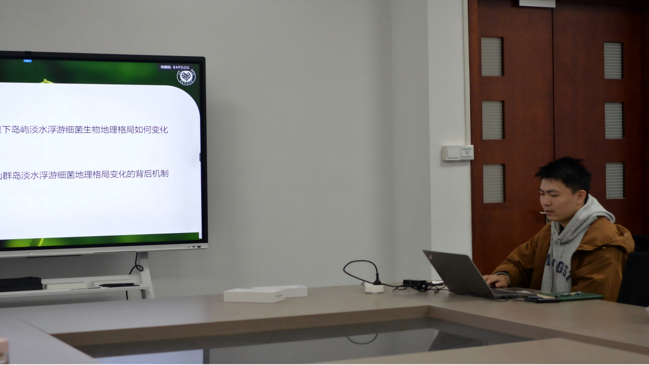 第一位汇报人是郝佳华同学,他口头报告的题目为《土地利用下舟山淡水水体浮游细菌的生物地理格局及机制》。他的汇报内容聚焦舟山群岛14个岛屿99个水体的淡水浮游细菌,发现土地利用通过改变小水体硝态氮和大水体铵态氮含量,影响蓝细菌多样性,导致浮游细菌传统种面积关系丧失,且该影响在100-150米缓冲区范围内最显著。第二位汇报人是黄静同学,她进展快报的题目为《颗粒有机碳与微生物生活史策略调控亚热带森林土壤微生物碳利用效率对干旱的响应》。她的汇报基于全球多个气候带森林土壤的研究,表明微生物碳利用效率(CUE)随土层深度增加而下降,表层土壤CUE受微生物多样性主导,深层土壤受理化保护因素控制,基质质量和可利用性是关键驱动因子。第三位汇报人是张博博同学,他口头报告的题目为《氮添加改变了生态系统的下行效应从而抑制了植物多样性》。研究中的草地控制性实验显示,氮添加会改变生态系统效应,通过让优势植物改变叶片性状、提高蜘蛛捕食成功率抑制蝗虫,使系统从下行效应转为上行效应,最终抑制植物多样性。第四位汇报人是吴政澜同学,她口头报告的题目为《气候变化和陆源输入降低了未来北冰洋生物碳泵的效率》。该研究利用FESOM2.1–REcoM3模型模拟发现,气候变化和陆源输入虽提升北极海洋净初级生产力,但通过增强再矿化、改变浮游植物群落结构等,导致生物碳泵效率下降,使北极从“碳汇”向“碳源”转变的风险上升。