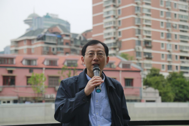 上午10点,师生步行至长宁区苏州河景观步廊参与第二场讲解。上海英凡环保技术公司董事长、华东师范大学生态与环境科学学院校友张明成向同学们介绍了位于苏州河对岸的公司的简介、自身的创业经历以及一个企业所需要的员工是什么样的。讲解结束后,张总就同学们提的问题建议同学们作为一个环境专业学生不仅要注重专业知识的学习,更要注重对相关政策、法律法规、新闻的关注。随后同学们与张明成董事长在景观步廊拍摄了合影,便赶路前往下一站——强家角人行桥。