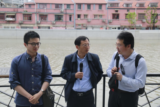 下午5点,老师们、同学们沿苏州河行至浙江路桥,杨凯老师与丁磊博士在沿岸景观台中结合课题组的工作与苏州河水污染治理的关系,为同学们详细讲解了苏州河前四期治理的成果、方法与具体工程,具体讲解了苏州河底泥疏浚的相关技术,也解答了同学们对于苏州河水闸调度引水治污的原理,科普了水十条考核断面的相关知识。杨老师与丁博士的讲解内容通俗易懂,还吸引了许多市民驻足旁听。