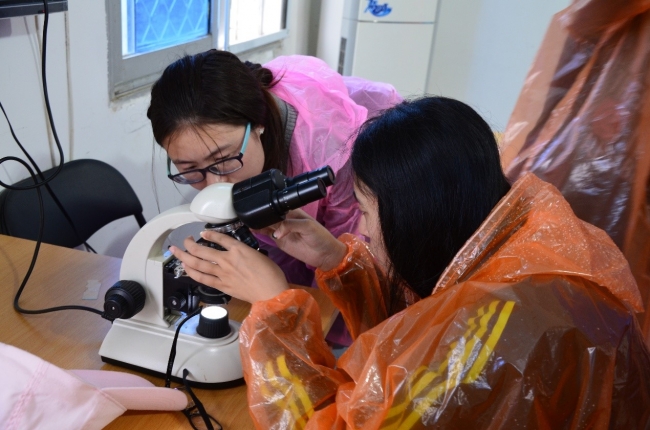 学生正在利用显微镜观察水样