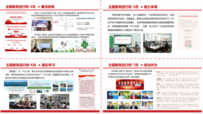 支部书记谭珊珊首先代表支部委员会汇报今年4月以来支部依托“三会一课”和主题党日活动,围绕学思想、强党性、重实践、建新功的主题教育总要求,扎实开展主题教育的情况。在“学思想”方面,支部全体党员参加了学院党委书记刘婕以“深入调查研究,干实事谋实招求实效”为题的读书班研讨,共同学习了《习近平关于调查研究论述摘编》主题教育学习材料,为写好高质量调查报告打牢基础。支部书记谭珊珊以“从‘千万工程’看习近平生态文明思想的生动实践和乡村振兴之路”为题,带领支部党员学习了习近平总书记关于“千万工程”的重要指示批示精神。在“强党性”方面,支部纪检委员陈然以“永远吹冲锋号”为题,结合《论党的自我革命》主题教育学习材料分享了党的自我革命的重大意义和十八大以来全面从严治党的理论和实践。通过观看《榜样7》专题节目,支部全体党员均结合各自工作内容,谈学习体会,讲奋斗目标,把对“榜样”的崇高敬意转化为干事创业的不竭动力。在“重实践”方面,学院财务秘书施卉晰以“廉洁”为题带领大家重温了中央八项规定精神和《中国共产党廉洁自律准则》,并结合学校最新财务制度,为支部党员梳理了日常报销中的常见问题。支部党员结合各自主题教育学习情况,逐一发言,同时也针对支部活动形式单一、为群众办实事等方面提出了建议。