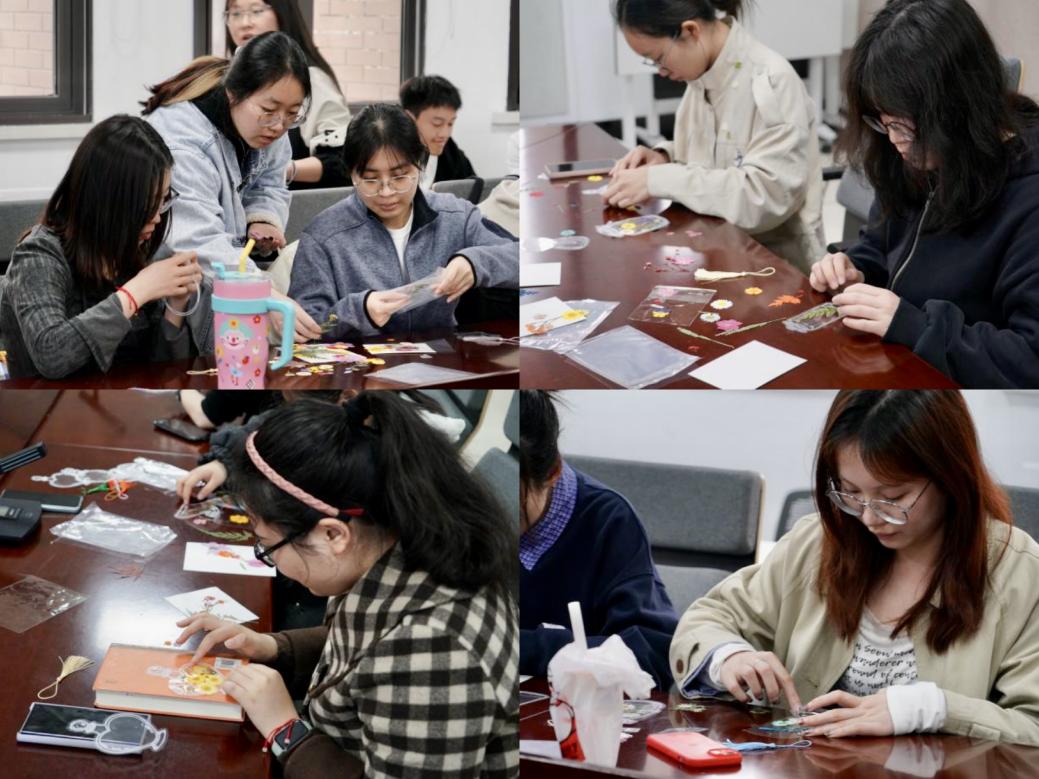 活动现场,桌面上整齐地摆放着各种经过脱水处理的干花以及精美的双层书签材料。由王英桥同学为大家详细讲解了押花书签的制作步骤,并展示了多款精美的成品示例,为同学们提供了丰富的创作灵感。