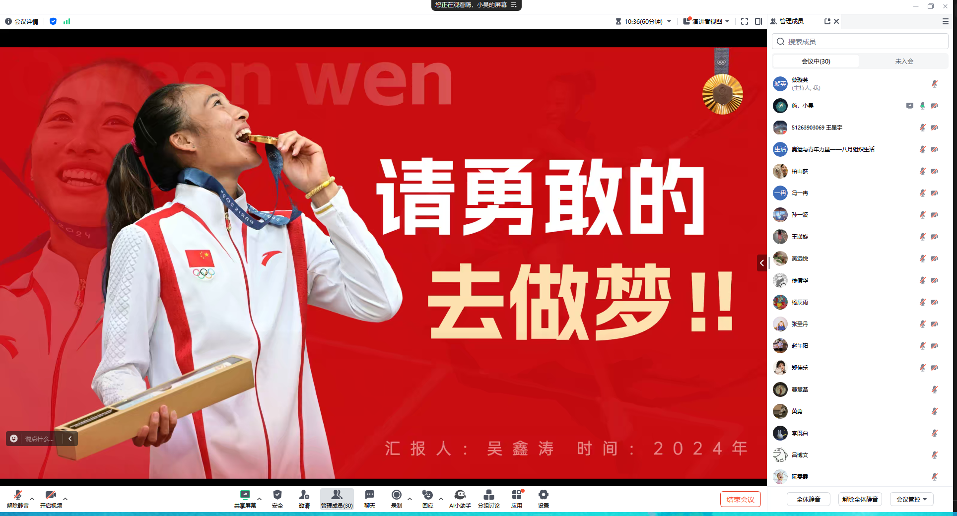 通过这次分享,大家收获颇丰,从巴黎奥运会中国运动员的每一次登场、每一次突破、每一枚奖牌中,我们看到了团队拼搏奋斗的精神,这展现着团队协作的意志,体现着团队的凝聚力和战斗力。在竞争日益激烈的奥运赛场,强大的团队、团结的力量是实现奥运梦想的重要基石。