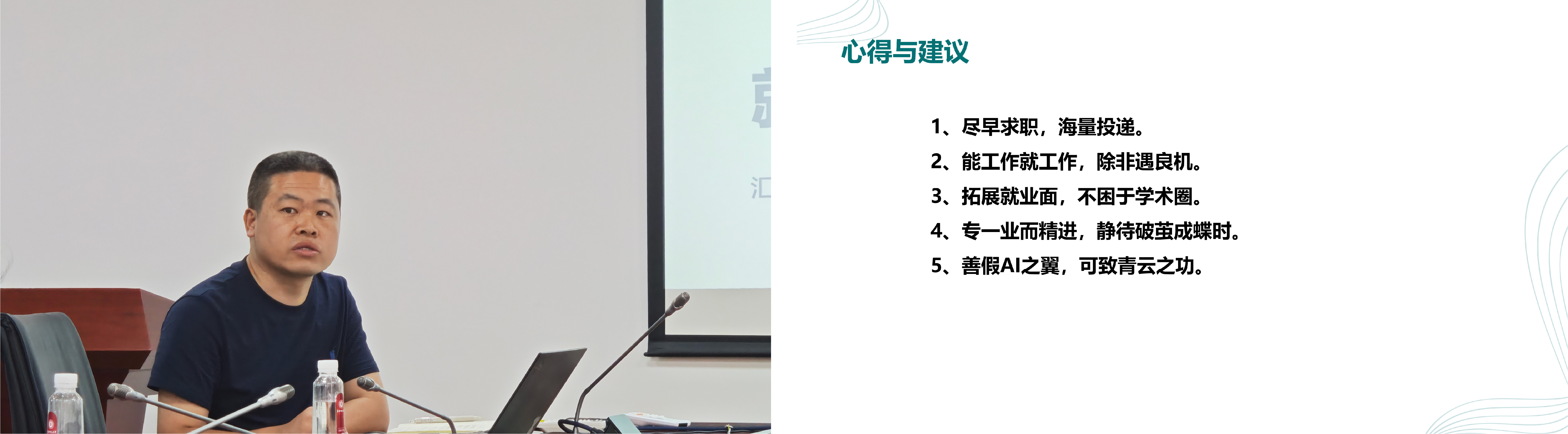张树栋博士现任华东师范大学生态与环境科学学院工程师,他针对当前博士就业形势进行深入分析,指出随着博士生规模扩大与就业岗位供给不足的供需不平衡和“唯学术论”就业观念的影响,毕业生面临较大就业压力。对此,他建议大家:一要尽早启动求职计划,把握就业黄金期;二要拓宽就业视野,不困于学术圈,关注多领域机会;三要着力提升自身能力,增强核心竞争力。