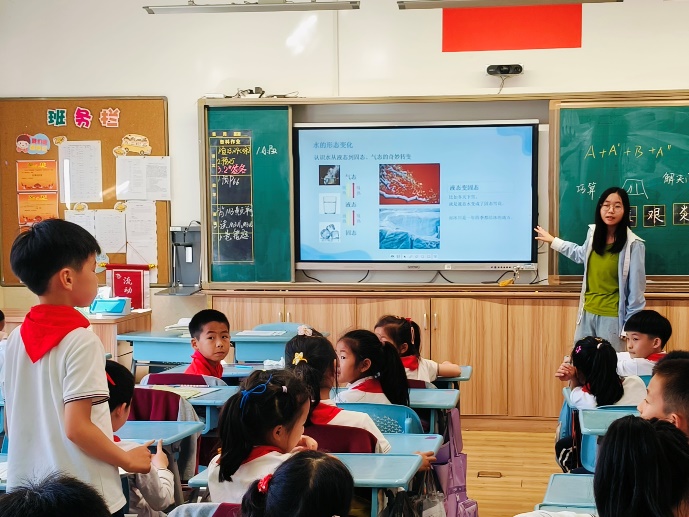 课程伊始,讲师们以“小水滴的环球旅行”这一充满童趣的比喻切入,瞬间抓住了同学们的注意力,让现场气氛迅速活跃起来。紧接着,讲师们通过生动的讲解和形象的图片展示,向同学们介绍了水的三态——固态、液态和气态。结合生活中的常见现象,如冰箱里拿出的饮料瓶外有水珠、冬天下雪等,讲师们用通俗易懂的语言讲解原理:“冰雪融化成水,是固态变液态,需要吸热;水蒸发变成水蒸气,是液态变气态,同样需要吸热……”帮助同学们轻松理解水的三态变化。
