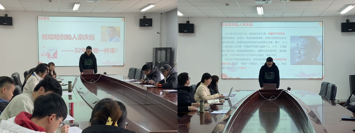本次活动中,第五党小组围绕“娃哈哈创始人宗庆后——32年只做一件事!”作时政要闻分享,回顾了中国共产党党员、全国劳动模范、娃哈哈集团董事长宗庆后同志的生平成绩和创业经历,详细介绍了哇哈哈企业创立、销售模式、推广宣传等方面的发展和崛起之路,同时也阐述了宗庆后同志创业成功的秘诀在于专注发展实体经济,指出宗庆后同志与哇哈哈产品所体现的爱国情怀及其在社会责任和公益事业方面的突出成就,并号召各位党员向优秀的先辈学习,积极履行社会责任,实现人生价值。