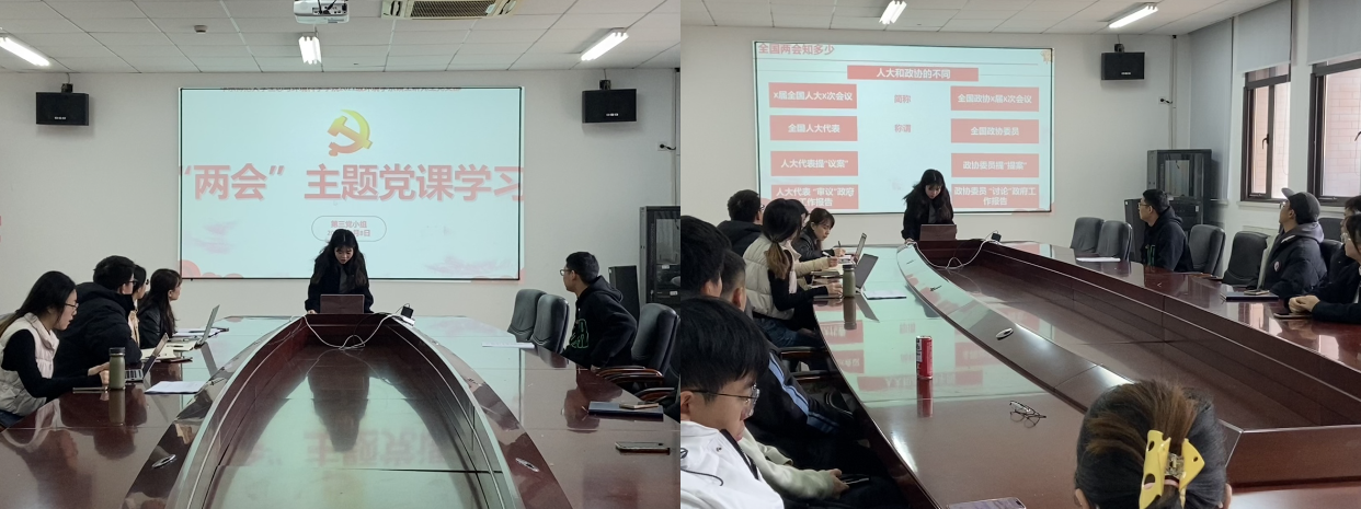 为了学习贯彻习近平总书记重要讲话精神和全国“两会”精神,深入领会党的路线、方针与政策,引导青年党员深刻领会、准确把握“两会”精神实质,2024年3月8日上午10:00,生态与环境科学学院2021级环境学硕士研究生党支部于闵行校区资环楼269室开展专题组织生活。本次活动由第五党小组主持,主要包括时政要闻分享和“两会”主题党课学习两个部分,支部指导老师吴丹和全体党员到场参会。