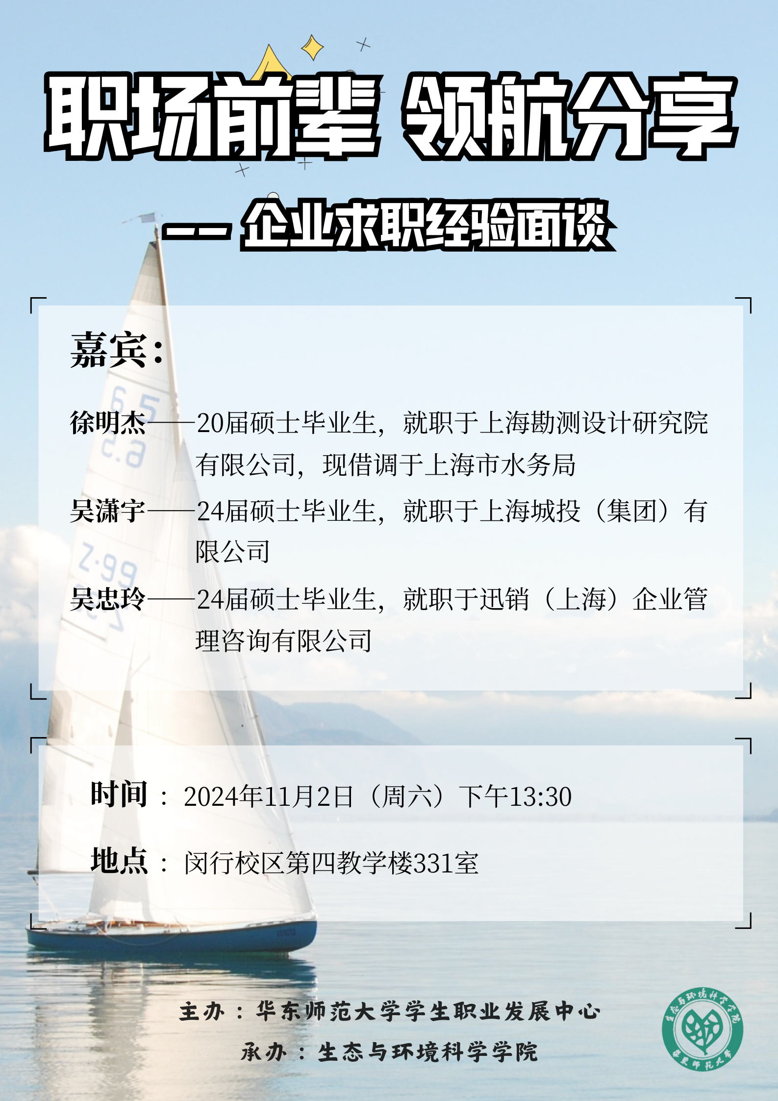 为助力同学们了解职场动态,掌握有效的求职策略,提升个人就业竞争力,为未来的职业生涯奠定坚实基础,生态与环境科学学院于2024年11月2日在闵行校区四教331教室举办“职场前辈,领航分享——企业求职经验面面谈”就业分享活动。活动邀请20届生态学系硕士毕业生徐明杰、24届环境学系硕士毕业生吴潇宇和吴忠玲重回母校,和同学们分享他们的求职经验和工作感悟。专职辅导员吴丹和60余位学生参与本次活动,活动由研会生涯部负责人王九洲主持。