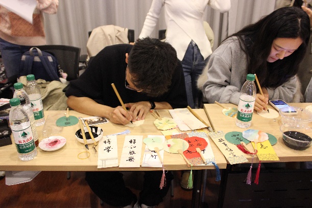 本次联谊活动通过以小组为单位的破冰游戏,迅速打破了初见的拘谨与陌生,让大家在欢声笑语中逐渐熟络起来。随后,参与者们便可自由组队,投身到游园会的各个精彩环节中。各学院精心准备了互动小游戏,有增进了解的“你划我猜”“爱的传递”等,还有脑力挑战“拼贴诗集”“正话反说”等,以及各种手工体验活动,包括“DIY飞盘”、“扎染”、“扭扭棒手工”、“扇画”等。每一个活动都吸引了许多热情的参与者,现场气氛热闹非凡。