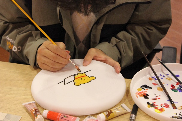“DIY飞盘”区域聚集了大量对创意手工充满热情的同学。活动开始前,工作人员早已准备好了各式各样的飞盘材料、画笔、颜料,等待大家的创意“改造”。